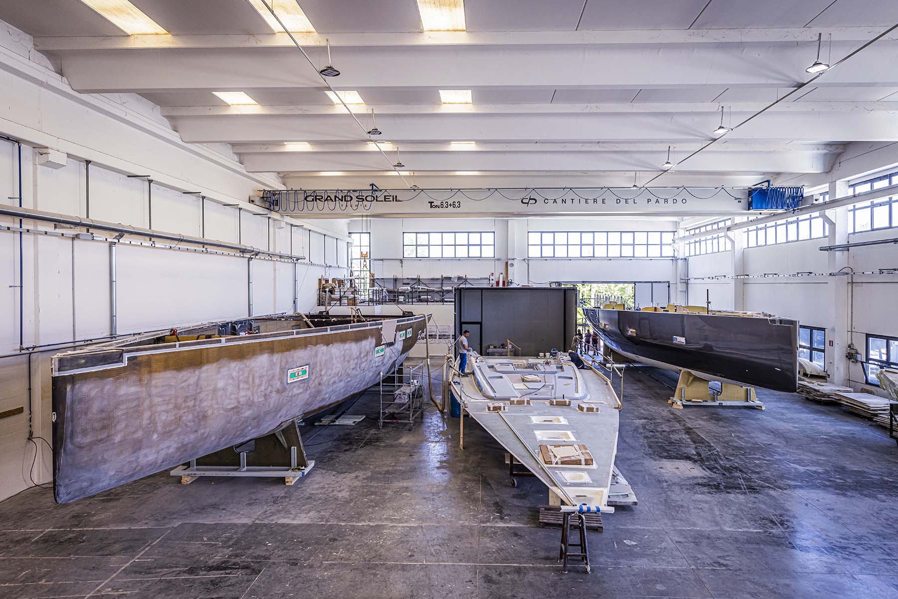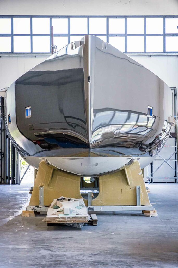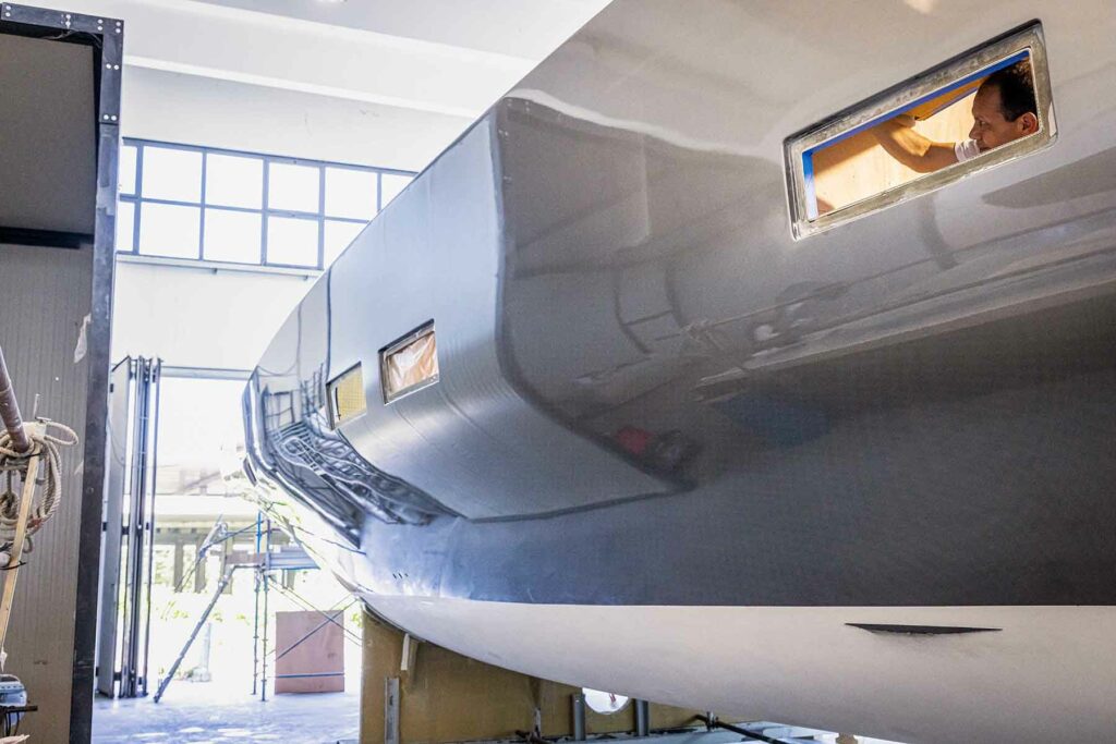 Gli ultimi scatti di Alberto Cocchi realizzati in produzione, vogliono infatti immortalare lo stato di avanzamento lavori precedenti alla fusione tra scafo e coperta. Un passo fondamentale nel processo di assemblaggio prima di passare all’allestimento degli interni e alle finiture dello scafo.