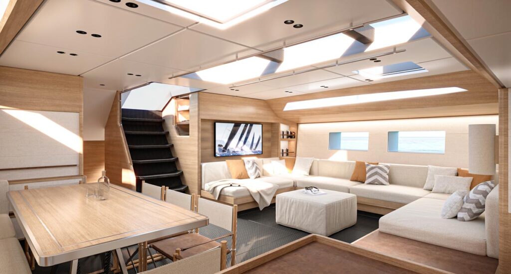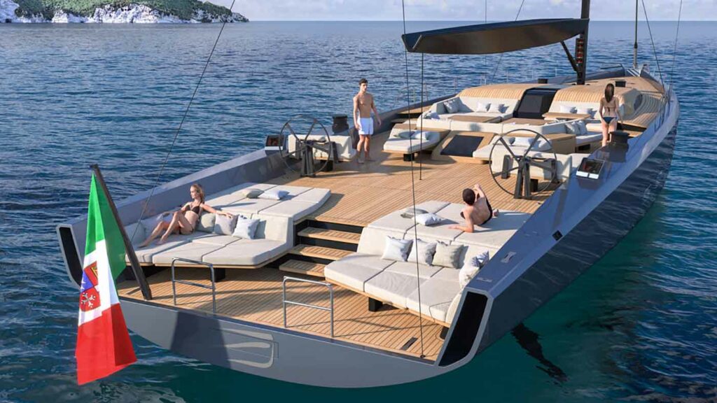Le linee purissime abbracciano ampi spazi dedicati alla vita sociale e agli ospiti, cominciando dall’enorme pozzetto di 80 mq, il doppio di quelli presenti su imbarcazioni di questa lunghezza, che si sviluppa su un unico livello e si estende per tutto il baglio, sino all’alta e sicura impavesata che sostituisce la classica battagliola. Il layout è totalmente personalizzabile e offre posto a sedere per 15 persone. Gli unici elementi fissi sono le ruote gemelle in carbonio dei timoni e il tambuccio d’ingresso per l’equipaggio.