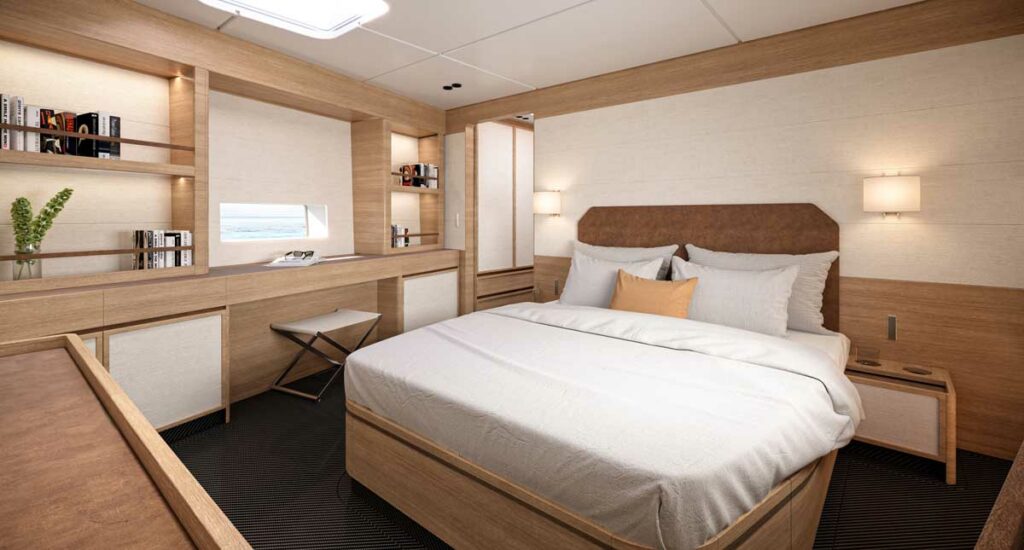 L’ampia cabina armatoriale di prua prevede diversi allestimenti, tra cui quella con una cabina armadio, quella con bagni separati per lui e per lei, o quella con sedute relax. A bordo sono previste altre tre suite per gli ospiti, più due cabine per l’equipaggio e una riservata al capitano. Per quanto riguarda finiture e arredamento, Wally propone un interno sportivo in legno sbiancato con dettagli in carbonio, ma la decisione finale spetta all’armatore che potrà personalizzarli a suo piacere.