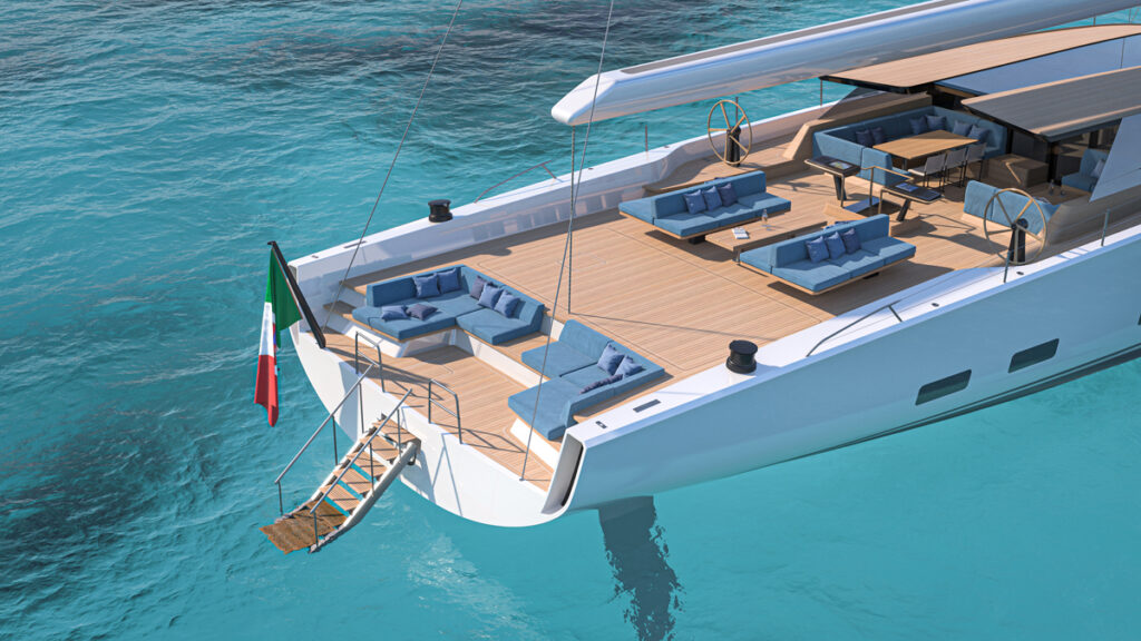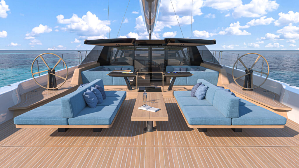 Centrale nella visione di entrambi i progetti è l’innovativo layout “double deck” Wally, che colloca il pozzetto a prua della timoneria sotto una spettacolare tuga con ampie vetrate curve, rinforzi in carbonio e pannelli delicatamente illuminati, creando un effetto quasi magico. Il risultato è una vista mozzafiato dove lo sguardo abbraccia l’intero orizzonte, vele comprese. È difficile immaginare una zona pranzo o un salotto all’aperto più scenografici!