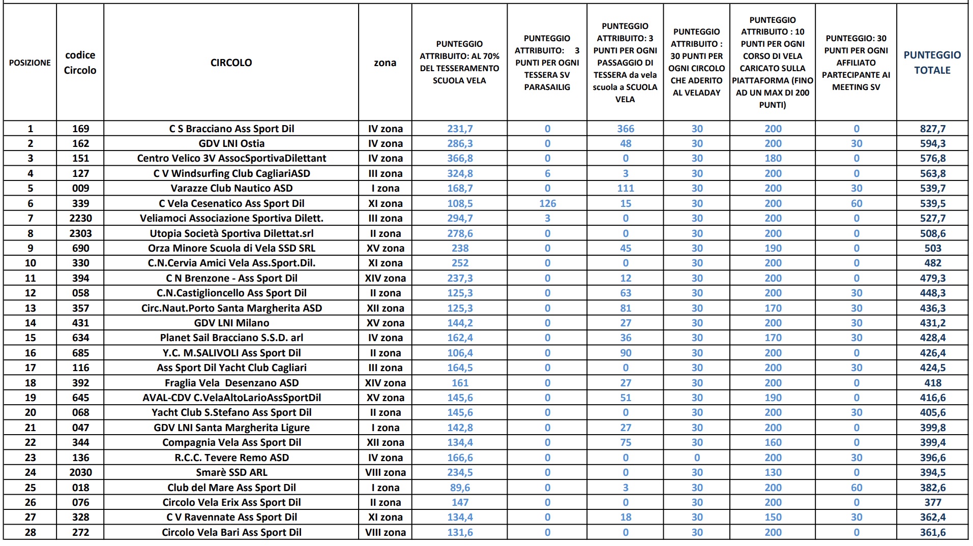 - 30 punti per ogni circolo che ha partecipato ai Meeting Scuole Vela.