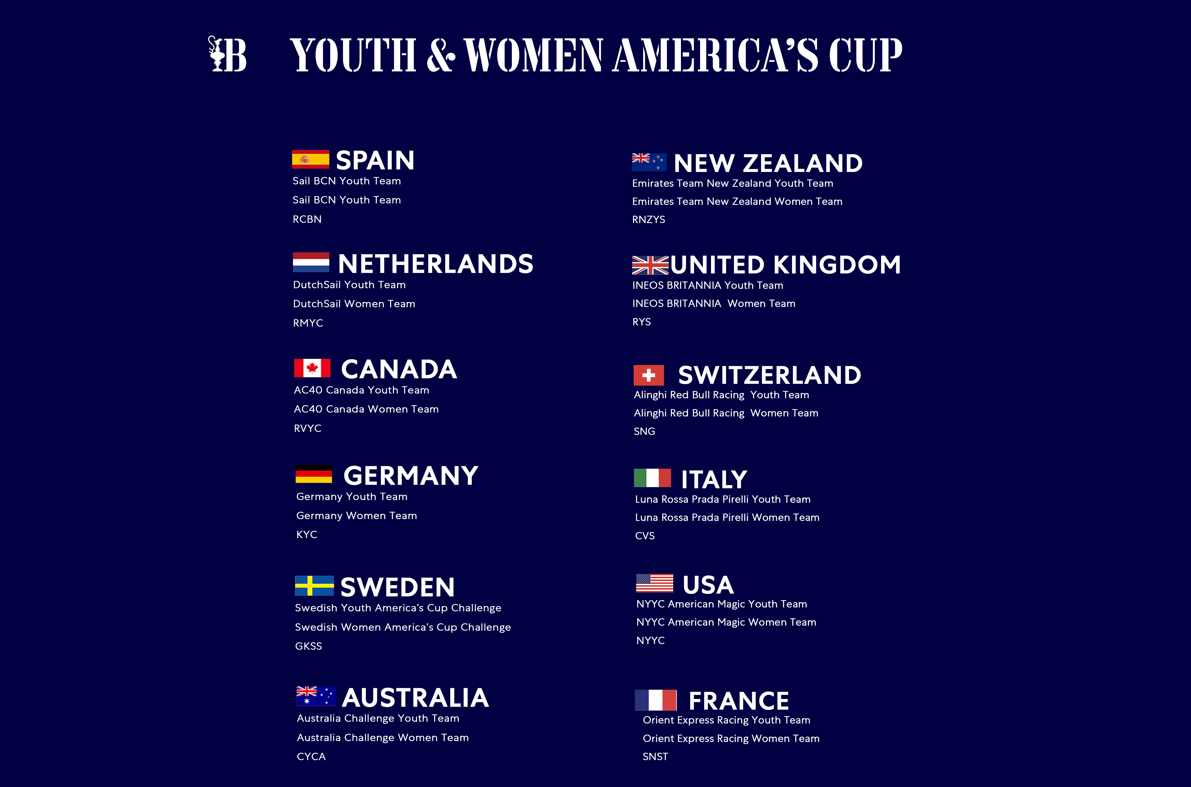 La line-up per l’America’s Cup giovanile e femminile è stata completata con l’annuncio dei team provenienti da Germania, Svezia e Australia che si uniranno ai sei partecipanti ufficiali stabiliti per l’America’s Cup in rappresentanza di Nuova Zelanda, Gran Bretagna, Italia, Svizzera, America e Francia insieme alle già confermate squadre di Youth & Women’s America’s Cup in rappresentanza di Spagna, Olanda e Canada.