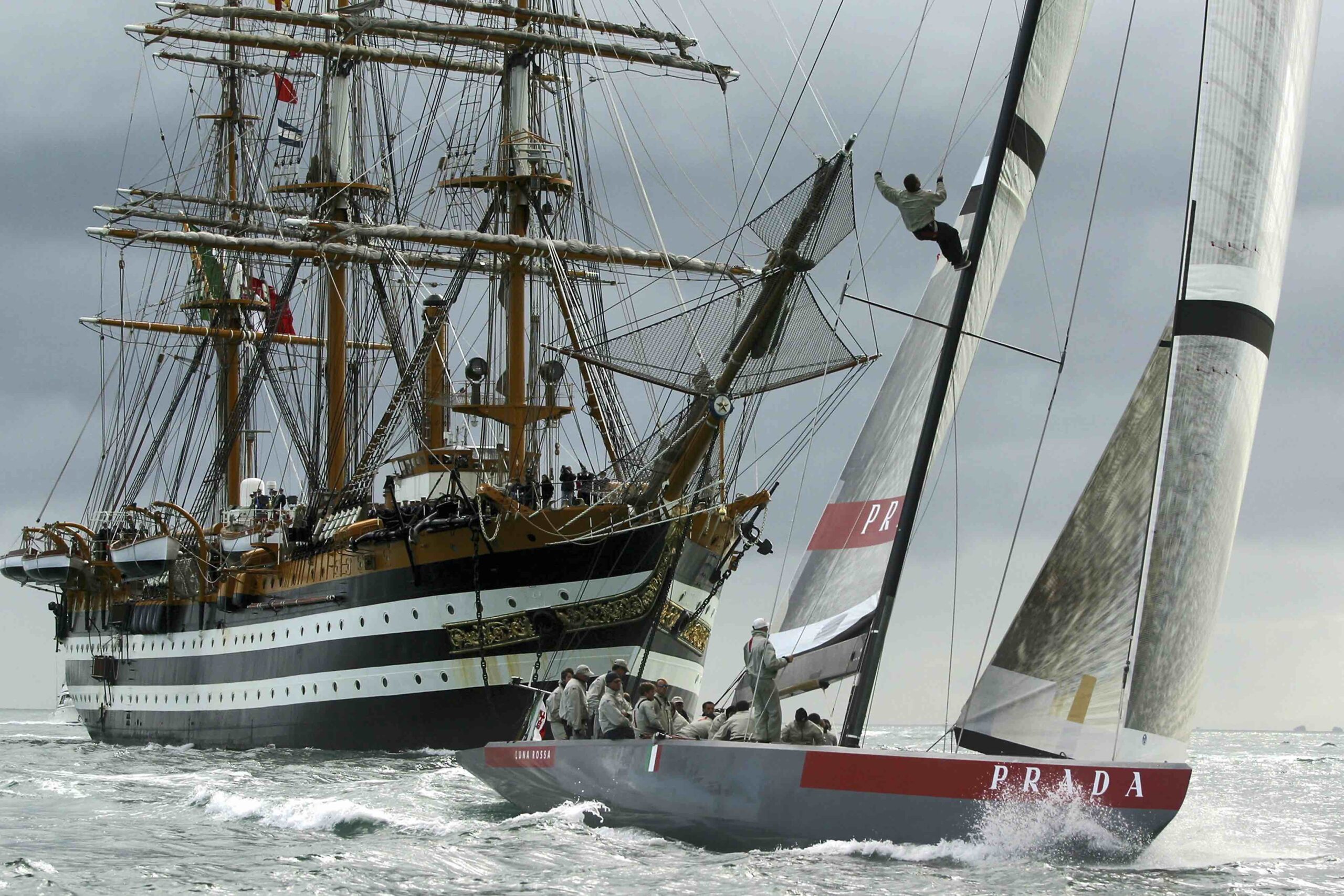 Nel 2002, infatti, mentre Luna Rossa si accingeva a disputare la sua seconda Coppa America ad Auckland (con il monoscafo appartenente all’America’s Cup Class), il Vespucci faceva tappa nella città neozelandese durante la sua prima circumnavigazione del globo. In quell’occasione, davanti a migliaia di fan e alle televisioni collegate per seguire l’evento più antico nella storia dello sport, le due imbarcazioni si diedero appuntamento nel Golfo di Hauraki, dove vennero immortalate dall’obiettivo di Carlo Borlenghi in uno scatto diventato iconico.