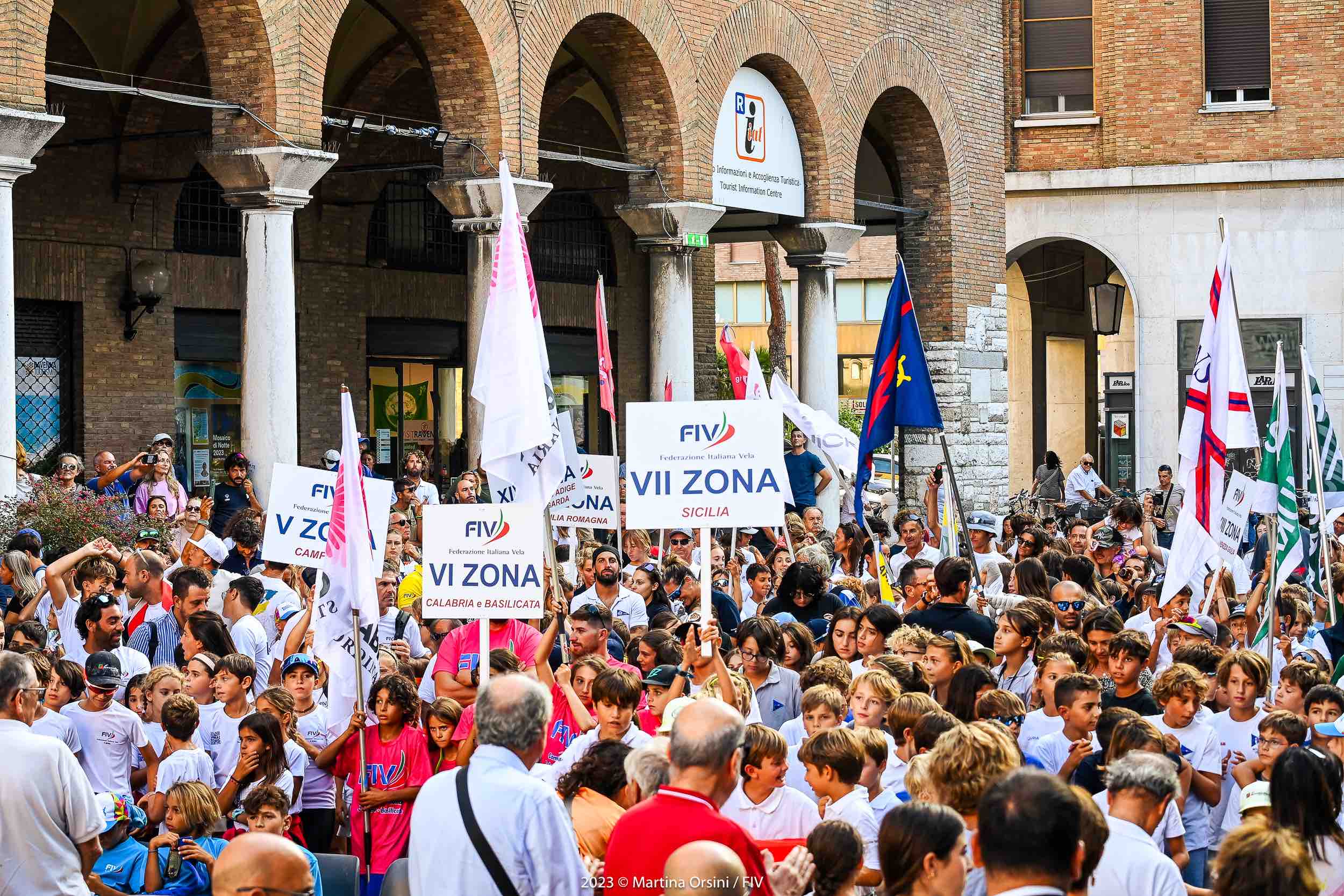 La festa della Primavela è iniziata come da tradizione con la sfilata delle squadre delle 15 Zone (le Regioni FIV), iniziata con un ritrovo a Largo Giustiniano e partita da Piazza del Popolo, accompagnata da uno spettacolo di sbandieratori e dalla Banda musicale cittadina di Ravenna. Dalla prima Zona (Liguria) alla quindicesima (Lombardia Piemone e Valle d’Aosta), con l’ultima Zona, quella ospitante, l’undicesima: Emilia Romagna: un lungo serpentone formato dai 500 giovanissimi partecipanti alla regata. Sono arrivati a Piazza San Francesco, dove sul palco allestito davanti all’entrata della chiesa omonima, del IX-X secolo, poco distante dalla tomba di Dante Alighieri, si sono succeduti i saluti delle istituzioni e gli interventi che hanno portato all’apertura ufficiale dell’evento.