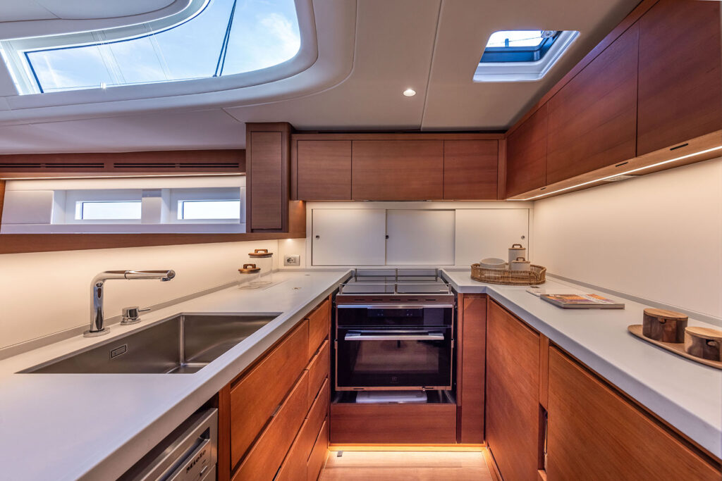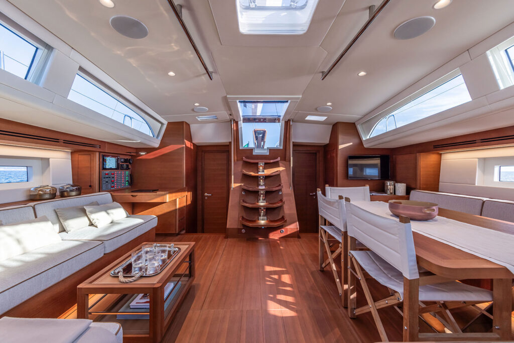Sottocoperta, il Grand Soleil 65LC differisce leggermente rispetto alla versione Performance. Il salone, posto in posizione rialzata rispetto alle cabine per lasciare spazio alla sala macchine, ospita una sala relax ed un’area pranzo. Questa soluzione permette uno spazio maggiore nelle due cabine di poppa, più grandi per l’assenza del vano tecnico solitamente posizionato tra di esse. Questo layout assicura anche altri vantaggi: il salone più vicino al livello del pozzetto permette di realizzare una scala di dimensioni ridotte. Infine, sfruttando appieno il baglio massimo, questa disposizione regala una vista a 270 gradi sull’esterno. Il Grand Soleil 65LC prevede la cucina a centro barca, creando così un unico grande open-space unito alla zona giorno.