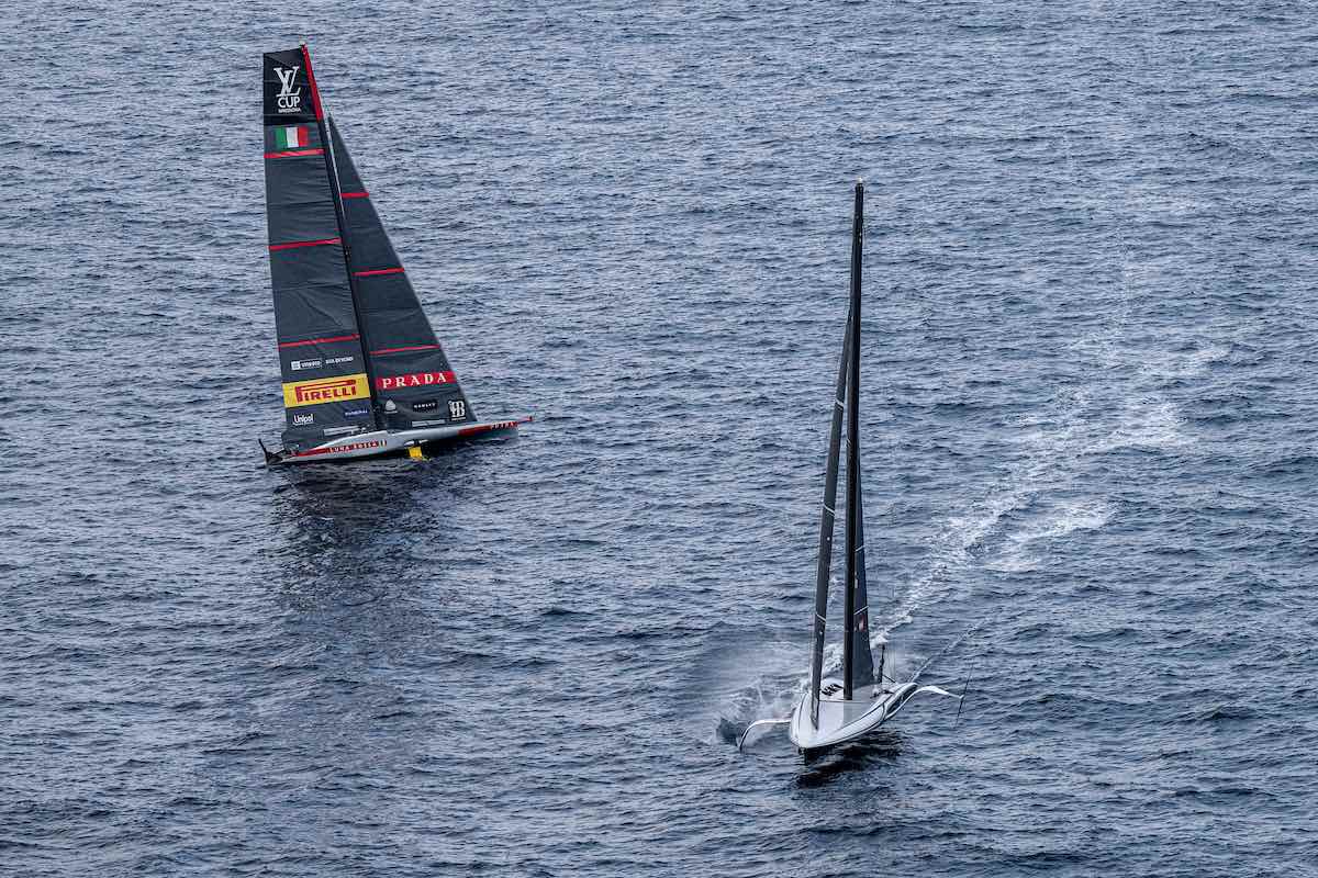 La prima regata di giornata è un match complesso, faticoso e ricco di colpi di scena quello tra Luna Rossa e American Magic, corso con vento da Est sui 7 nodi e onda. Luna Rossa vira subito dopo lo start e si allunga sull’avversario, girando la prima boa avanti per 47”. La poppa è una delle più combattute viste sino a oggi, con continui cambi di leadership. Le condizioni al limite richiedono massima attenzione da parte dell’equipaggio italiano, che deve eseguire ogni manovra con estrema delicatezza per non cadere dai foil. Navigare sul vento è prioritario in queste situazioni, ma si rivela una scommessa, vista la brezza talmente instabile, come direzione e intensità, che al terzo cancello Luna Rossa è impossibilitata a manovrare per girare la boa, perdendo metri preziosi su American Magic. Nonostante gli sforzi dell’equipaggio italiano, il vento non permette di riprendere il volo e ribaltare la situazione.