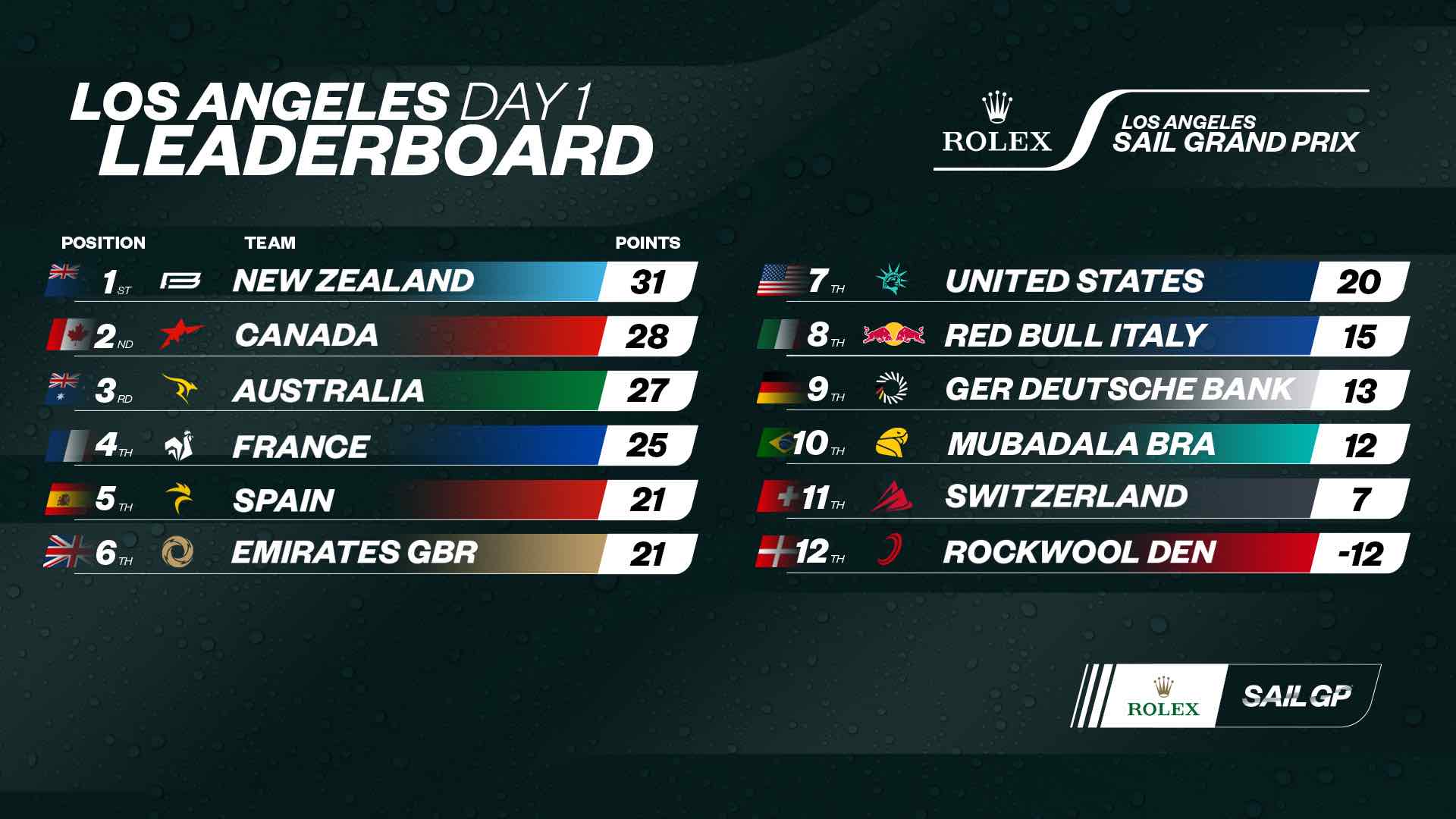 La Nuova Zelanda si impone nella prima giornata del Rolex Los Angeles Sail Grand Prix, conquistando la vetta della classifica provvisoria con 31 punti, grazie a due vittorie nelle quattro regate di flotta disputate. A inseguire da vicino ci sono Northstar Canada con 28 punti e l’Australia con 27 punti, pronte a dare battaglia nel secondo giorno di competizione.