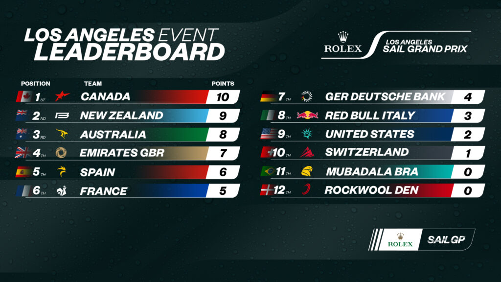 L’evento, svoltosi nel Porto di Los Angeles, ha visto la partecipazione di 11 squadre nazionali, con ROCKWOOL Denmark costretta al ritiro a causa di danni all’imbarcazione. Nella quinta regata della flotta, Emirates GBR ha ottenuto una vittoria netta, mentre nella sesta gara si è imposta l’Australia, seguita dalla Nuova Zelanda e dal Canada.