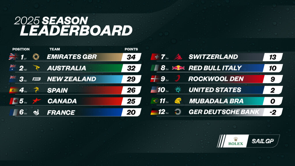 Con l’aggiornamento della classifica generale della stagione 2025, la Nuova Zelanda sale al terzo posto con 29 punti, mentre Emirates GBR e Australia mantengono rispettivamente la prima e la seconda posizione. Il Canada avanza dal sesto al quarto posto. Gli Stati Uniti, noni in classifica generale, hanno raccolto solo il secondo punto stagionale