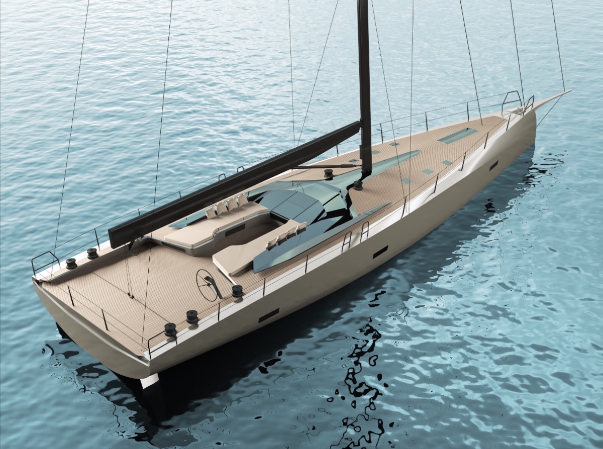 La coperta flush deck, laminata in carbonio – che a scelta dell’armatore può essere rifinita in teak o skydry – è piuttosto alta per tenere il bordo libero basso e ricavare generosi volumi interni, ed è studiata per ottenere il massimo dell’efficienza e della semplicità. Sfruttando il baglio importante della barca (6 m), quest’area, che scorre ininterrotta senza angoli o scalini, è stata ottimizzata per favorire le manovre dell’equipaggio ma può essere comodamente sfruttata dagli ospiti: avere le due ruote del timone in posizione avanzata, ad esempio, libera la porzione poppiera, che può essere facilmente arredata con un ampio solarium per un momento di relax in crociera.