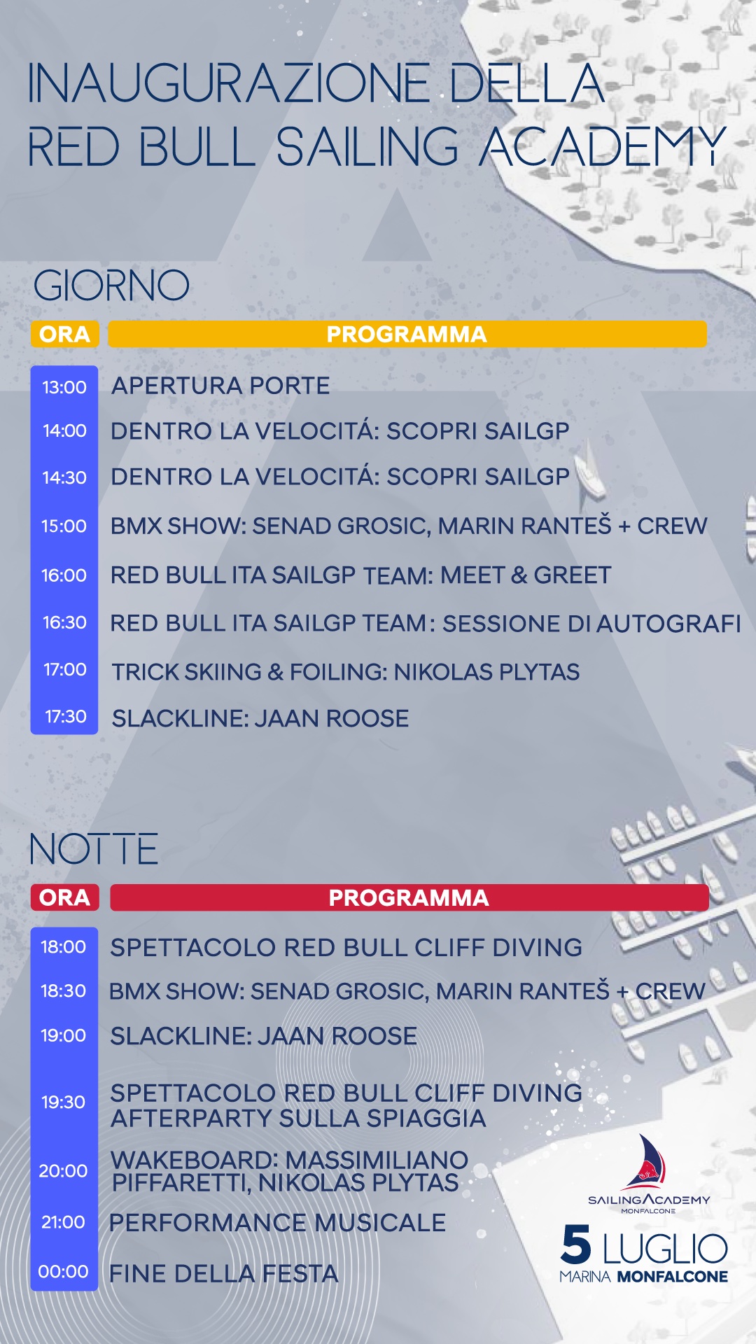 Una giornata a ingresso libero, aperta a tutti, che inizierà alle 13 e si concluderà a mezzanotte, tra esibizioni adrenaliniche, ospiti d’eccezione e momenti di spettacolo. Tra i protagonisti, nomi di rilievo come Ruggero Tita, oro olimpico a Tokyo, e Jimmy Spithill, leggenda dell’America’s Cup, insieme al Red Bull Italy SailGP Team, pronti a incontrare il pubblico e raccontare i segreti della vela ad alte prestazioni.