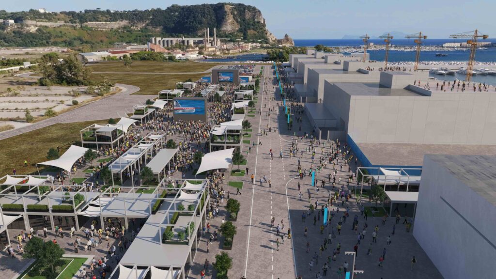 Un’animazione ha illustrato i piani per l’area di Bagnoli, destinata a diventare il cuore pulsante della competizione. Qui sorgeranno un centro tecnico di livello internazionale per gli AC75, una base dedicata per le regate Women & Youth America’s Cup con gli AC40, un nuovo marina per superyacht, spazi per il pubblico, centri media all’avanguardia e la sede organizzativa di America’s Cup Event (ACE). Non mancheranno il Tech Fan Village con aree interattive, maxischermi, intrattenimento, gastronomia e retail, il tutto protetto da una nuova diga foranea e a due passi dal campo di regata nel Golfo di Napoli.