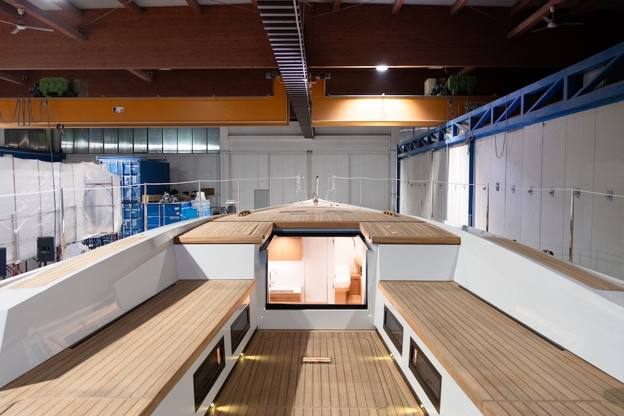 Le linee dello scafo portano chiaramente la firma di Bottino. Il baglio massimo arretrato, che si prolunga fino a poppa, assicura grande sostegno alle andature portanti e volumi generosi a centro barca. I fianchi presentano un leggero redan, soluzione studiata per ridurre la resistenza idrodinamica e mantenere la barca asciutta sull’onda, mentre la prua dritta rappresenta il punto di equilibrio tra estetica contemporanea, lunghezza al galleggiamento e abitabilità interna.