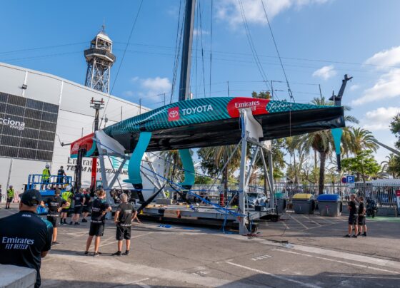 Clamoroso a Barcellona: L’AC75 di ETNZ cade dalla gru durante l’alaggio dello scafo