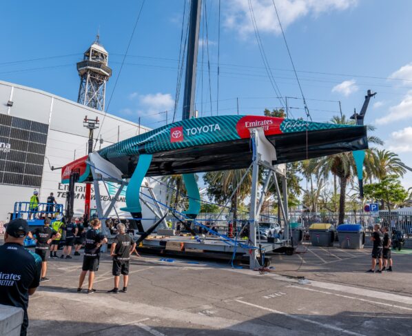 Clamoroso a Barcellona: L’AC75 di ETNZ cade dalla gru durante l’alaggio dello scafo