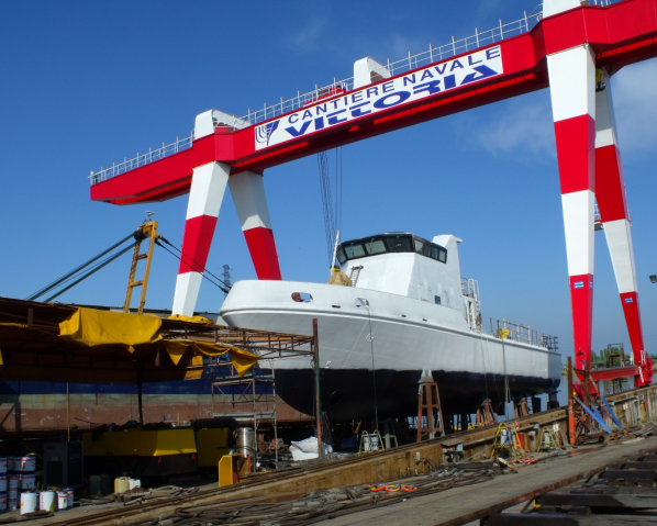 Al Cantiere Navale Vittoria il varo di una nave da lavoro con una gru record
