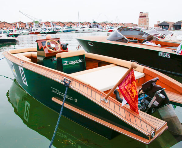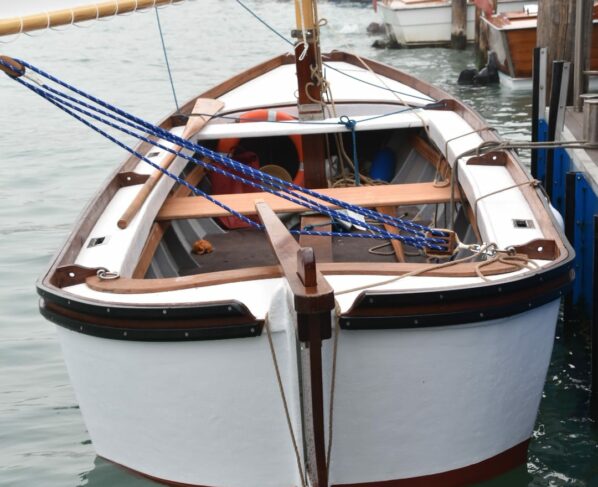 Una “Topetta” tradizionale, che può andare a remi, o a vela, ma dotata anche di un motore elettrico, posto al centrobarca, per abbassare il peso del baricentro, e poter veleggiare…