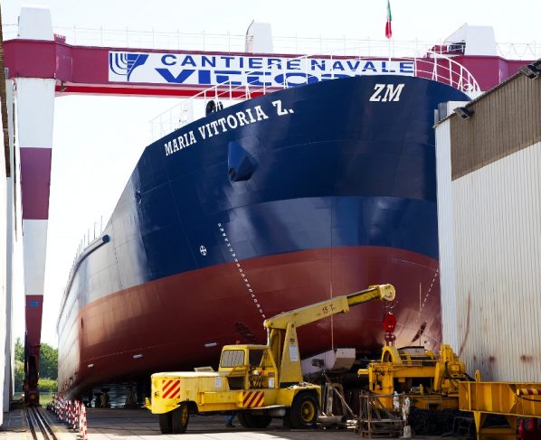 Al Cantiere Navale Vittoria il varo di una nave da lavoro con una gru record