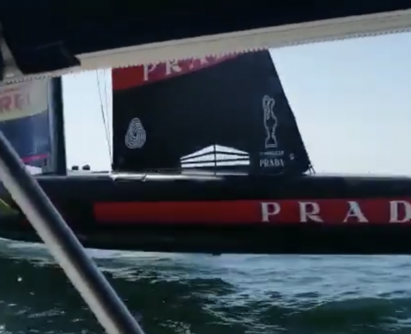 Incredibile inchino di Luna Rossa, immortalato dal laserista Enrico Guicciardi, che durante una sessione di allenamento sfiora un’imbarcazione di diportisti. Al timone sembra esserci Jimmy Spithill, che fa il pelo…
