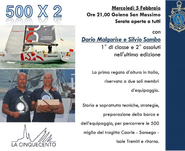 Sarà la 500 x 2 il tema portante della serata organizzata dalla Lega Navale Italiana di Padova il 5 Febbraio. La prima regata d’altura in Italia, riservata a due soli membri…